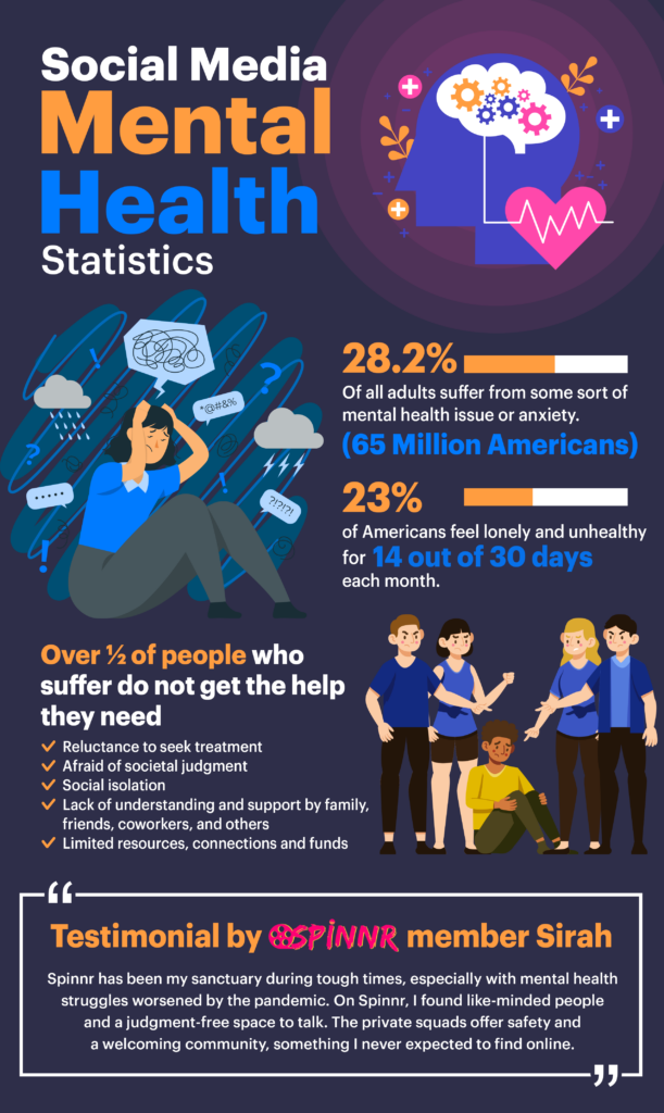 In today’s fast-paced and digital age, social media has become an integral part of our lives, connecting us with friends, family, and even strangers from around the world. However, as we delve deeper into the realm of virtual interactions, it is crucial to acknowledge the potential impact on our mental well-being. This post aims to shed light on the concerning statistics surrounding mental health and loneliness, particularly in relation to social media usage. Additionally, we will explore the importance of seeking support and share a testimony from a Spinnr member who found solace in our online community.